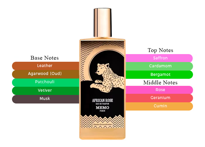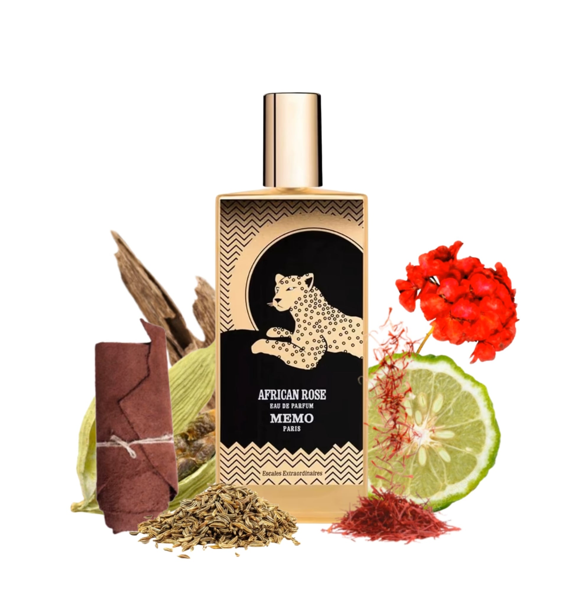 African Rose begins with a warm and spicy combination of saffron, cardamom, and bergamot, evoking an exotic atmosphere. The fragrance's core is enhanced by floral notes of geranium, which impart a gentle, romantic richness. At its base, a leather accord introduces a daring and untamed essence, striking a harmonious balance between floral sophistication and rugged intensity.