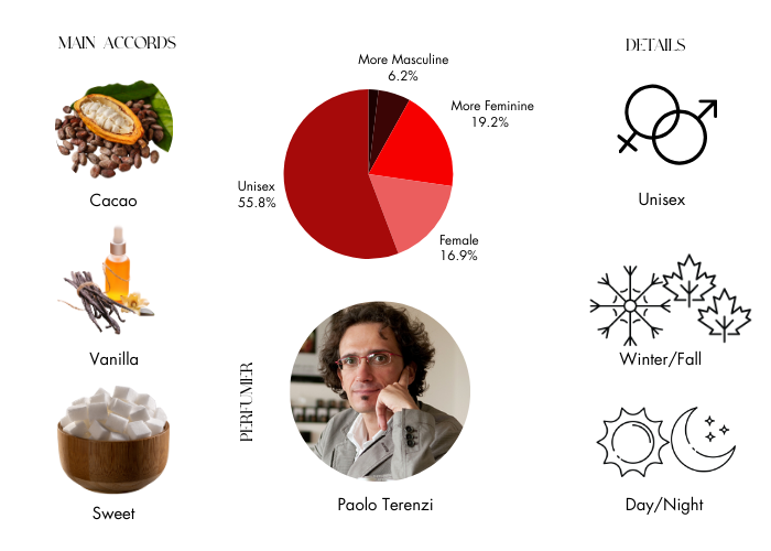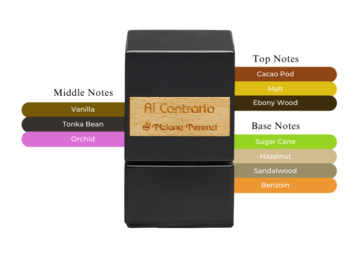 Tiziana Terenzi's Al Contrario begins with top notes of cacao pod, enhancing its rich depth. A hint of malt introduces a gentle sweetness, harmonizing with the boldness of the cacao. As the scent develops, it unveils the powerful, earthy character of ebony wood, anchoring the blend in a deep woody foundation. This perfume is a timeless addition to the Tiziana Terenzi collection, celebrated for its robust, aromatic personality, making it perfect for a cool evening out or an elegant night on the town.