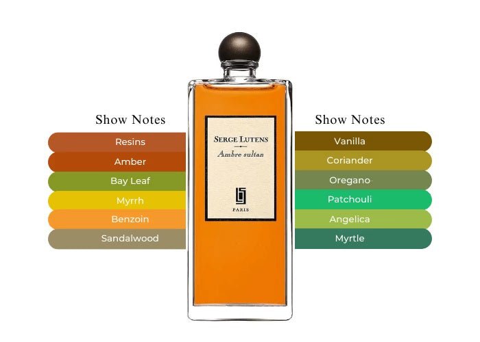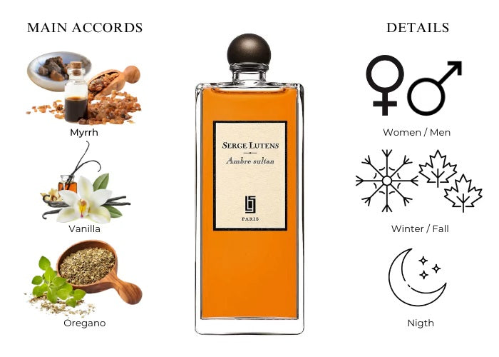 Ambre Sultan with its amber-spicy notes, the perfume presents a masterful interpretation of amber, offering a genuine and distinctive essence. It beautifully reflects the influences of Arab culture, inspired by Lutens' experience with a piece of amber resin in Marrakech. The fragrance features a blend of resins, amber, bay leaf, myrrh, sandalwood, benzoin, vanilla, coriander, oregano, patchouli, angelica, and myrtle.