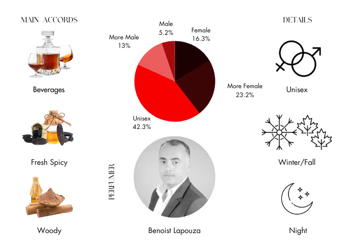 Angels' Share begins with a prominent top note of Cognac, which gracefully transitions into heart notes of warm Cinnamon, Tonka Bean, and strong Oak. The base features a rich combination of sweet Praline, luscious Vanilla, and earthy Sandalwood, providing a long-lasting aroma. This perfume embodies the founder's memories and the intriguing idea of the "angels' share", the evaporation of spirits in aging barrels, regarded as a quiet tribute to the divine.