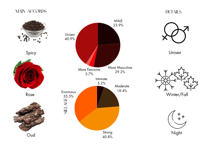 The base of this exquisite fragrance is a fusion of agarwood (oud) and oriental notes, which adds a rich, woody depth that lingers enticingly on the skin.