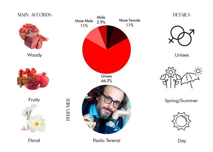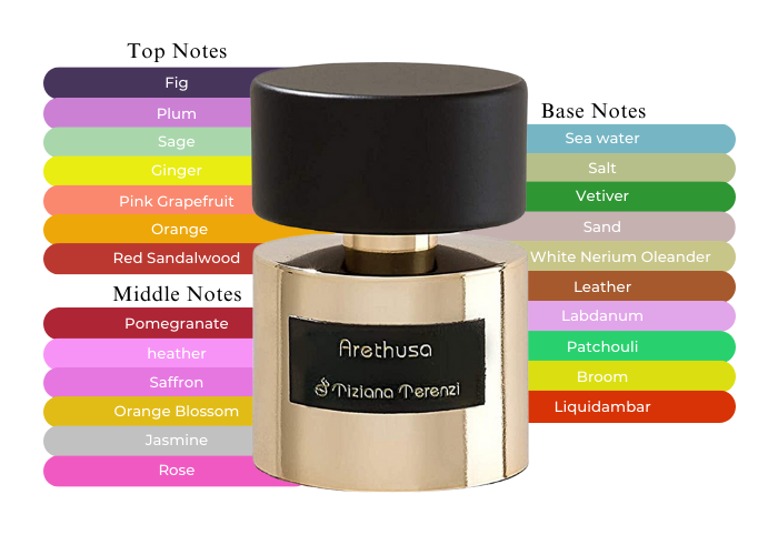 Tiziana Terenzi Arethusa features a lively fusion of fruity and floral elements, beginning with a refreshing combination of ginger, plum, pink grapefruit, red sandalwood, sage, fig, and orange. The heart reveals a refined bouquet enriched with rose, saffron, orange blossom, pomegranate, heather, and jasmine. The base notes, comprising leather, vetiver, patchouli, broom, white nerium oleander, and labdanum, lend a remarkable depth to the fragrance, rendering it truly exceptional.