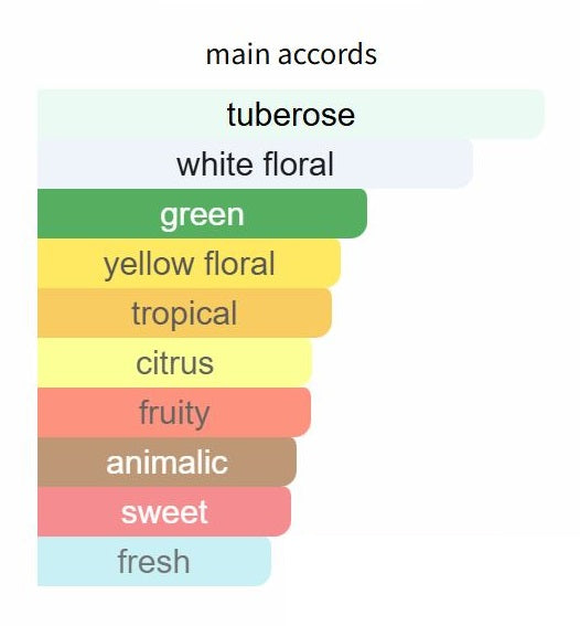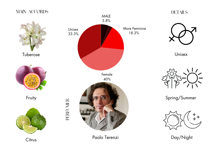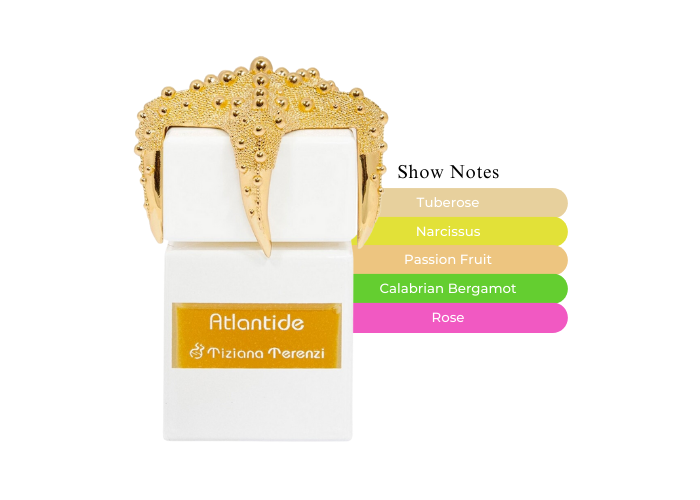 Atlantide by Tiziana Terenzi standout notes include Tuberose, Narcissus, Calabrian Bergamot, Rose, and Passionfruit, resulting in a distinctive and captivating aroma. The fragrance opens with fruity top notes of bergamot, tuberose, rose petals, and passionfruit, which harmoniously blend with middle notes of black currant, orange blossom, red berry, narcissus, and iris. It concludes with a warm base of ambergris, benzoin, and musk.