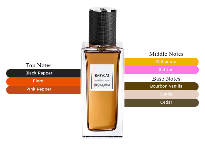 Babycat opens with a vibrant mix of black and pink pepper, enhanced by the exotic spice of black pepper and the resinous aroma of elemi. At its core, Babycat features the warm, aromatic essence of olibanum and the luxurious spice of saffron. The base notes of Babycat are rich and opulent, combining the creamy sweetness of bourbon vanilla with the smooth, leathery nuances of suede and the earthy, woody scent of cedar.