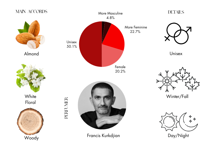 Baccarat Rouge 540 by Maison Francis Kurkdjian is a sweet, floral, woody and spicy scent with above-average projection and longevity. It has been classified as a unisex fragrance. This spicy, sweet-floral fragrance projects confidence and charisma while emitting a magnetic aura of excitement and danger. Each drop of this unique essence is adorned with a faceted red crystal to enhance its vibrancy.