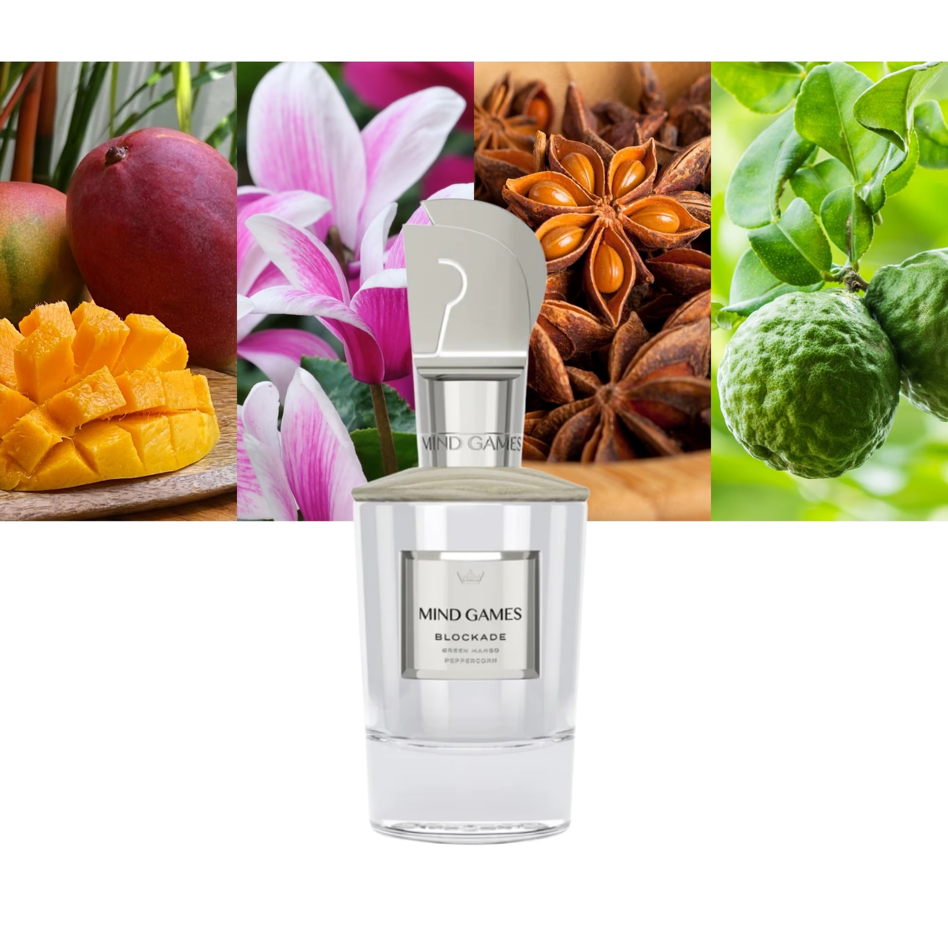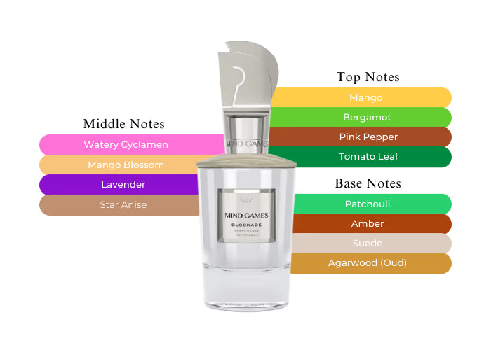 Blockade opens with a vibrant burst of mango, sparkling bergamot, spicy pink pepper, and the fresh green edge of tomato leaf. These top notes create an energizing first impression that sets the tone for this floral, fruity fragrance. As the scent develops, the heart reveals a captivating blend of mango blossom, soothing lavender, watery cyclamen, and the exotic twist of star anise—creating a smooth and aromatic middle that feels both grounded and uplifting. At the base, Blockade settles into a luxurious finish with warm amber, earthy patchouli, rare agarwood (oud), and soft suede.