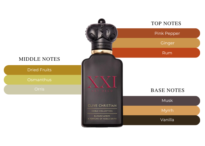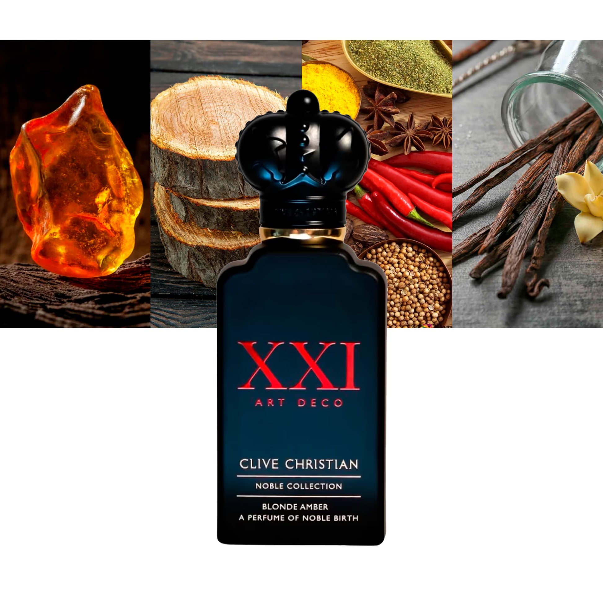 Noble XXI Art Deco Blonde Amber is part of the Noble Collection by luxury British niche brand Clive Christian. Blonde Amber combines warm amber notes with aromatic and smoky blonde tobacco, creating a rich and indulgent scent. The fragrance also features a riot of flourishing florals and dried fruits, adding a touch of sweetness and complexity. With its exquisite blend of ingredients, Blonde Amber is a truly luxurious fragrance that captures the spirit of the Art Deco period.