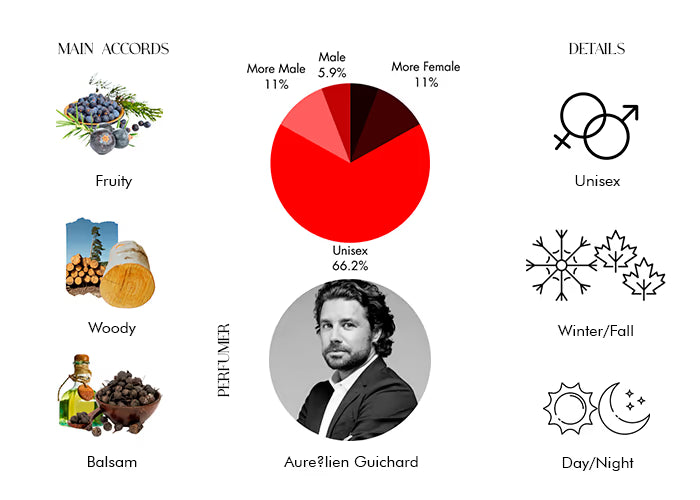 Bois d'Ebene captivates your senses from the very first spritz. The top notes of juniper berries provide a fresh and invigorating start. As the scent develops, the heart notes of guaiac wood bring a warm and woody depth, creating a rich and intriguing middle layer. Finally, the base notes of cypriol oil, also known as nagarmotha, and patchouli leave a lasting, earthy finish that lingers beautifully on the skin.