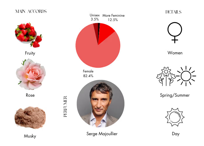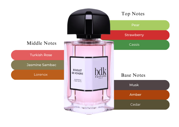 Bouquet de Hongrie delivers a sophisticated and multi-layered olfactory experience. The top notes of pear, strawberry, and cassis provide a fresh and fruity opening that instantly captivates the senses. As the fragrance evolves, the heart notes of Turkish rose, jasmine sambac, and lorenox unfold, revealing a rich and romantic bouquet. Finally, the base notes of musk, amber, and cedar offer a warm and lasting finish, ensuring the scent lingers beautifully throughout the day.