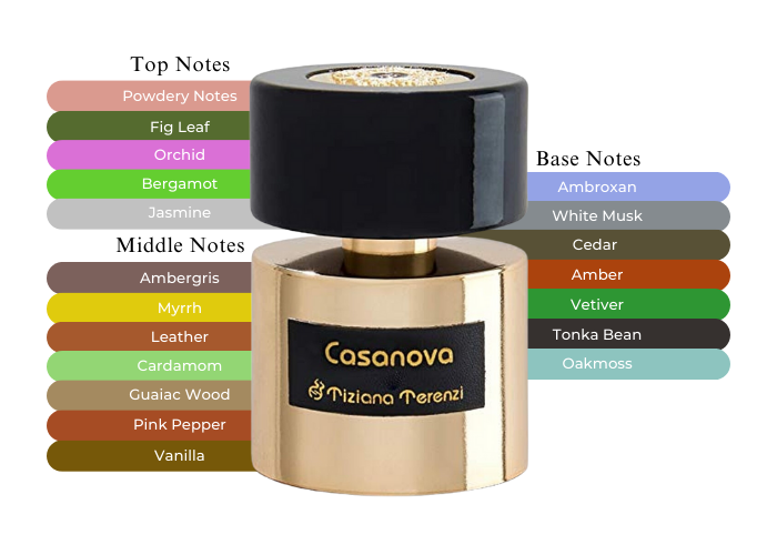 Tiziana Terenzi's Casanova opens with prominent notes of bergamot, orchid, and jasmine, transitioning into heart notes of pink pepper, vanilla, and cardamom. It concludes with a rich base of leather, guaiac wood, white musk, cedar, amber, oakmoss, and vetiver. This scent is a distinctive and enchanting aroma.