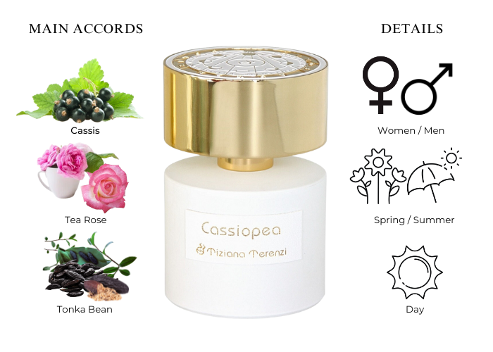 Tiziana Terenzi's Cassiopea opening notes offer a vibrant blend of passionfruit, refreshing lemon, and the sweet, earthy nuances of cassis and fern. As the scent develops, it unveils a heart composed of carnation, lily-of-the-valley, and tea rose, which adds a touch of floral elegance. Renowned for its enchanting allure, Cassiopea mesmerizes those around it with its warm, tropical essence, making it suitable for any occasion.