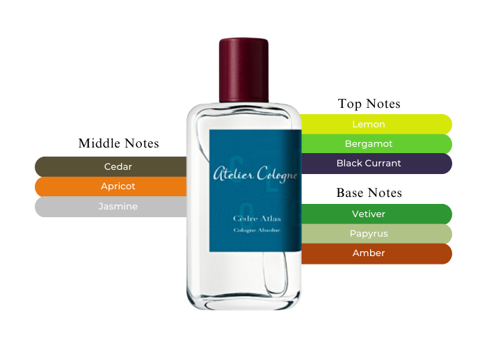 Atelier Cologne Cedre Atlas Cologne Absolue marries the enchanting freshness and sophistication of citrus notes with remarkable longevity, owing to its high concentration of essential oils. The top notes feature lemon, bergamot, and black currant, while the heart reveals cedar, apricot, and jasmine. The base notes include vetiver, papyrus, and amber.