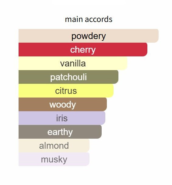 Cherry Cherry opens with a delightful blend of top notes, featuring the rich and inviting aroma of black cherry, complemented by the zesty freshness of bergamot and lemon. This invigorating combination sets the stage for the heart notes, where the earthy essence of patchouli meets the soft, sweet allure of heliotrope, orris root, and jasmine.