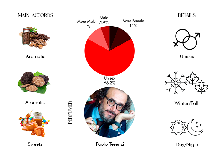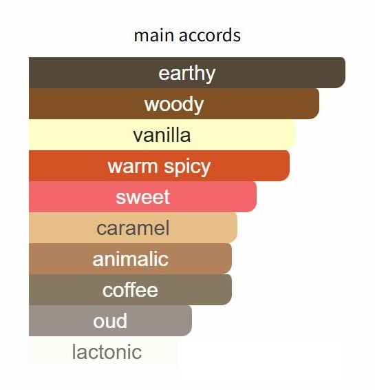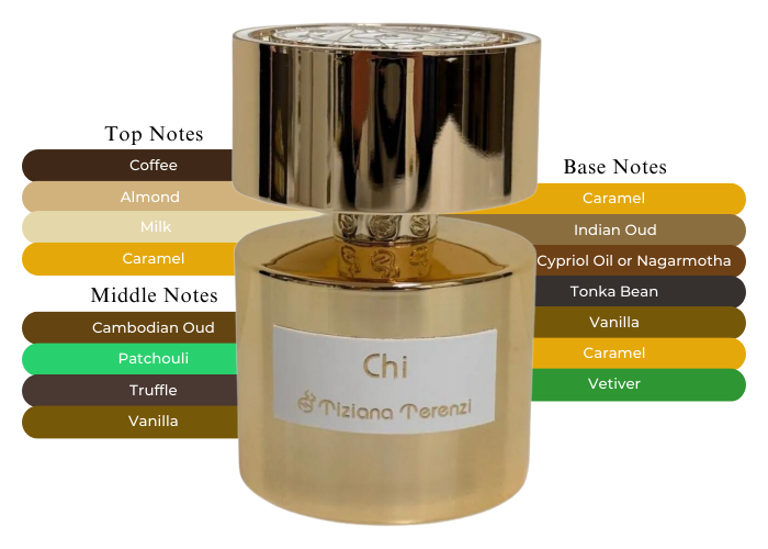 Tiziana Terenzi's Chi opens with top notes of almond, caramel, coffee, and milk, creating a warm and comforting ambiance. At its heart, the fragrance unveils a sumptuous blend of oud, patchouli, earthy notes, and truffle, accented by the sweetness of vanilla. The base notes extend the sweet profile with caramel and vanilla blossom, harmonized by the earthy nuances of cypriol and oud, along with the distinctive presence of Tonka bean.
