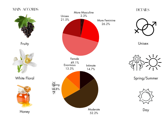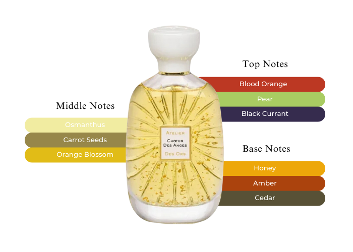 Choeur Des Anges features a delightful fusion of blood orange, pear, and black currant, leading into a captivating heart of osmanthus, carrot seeds, and orange blossom. The scent finishes with a seductive base of honey, amber, and cedar, resulting in a richly immersive character. Its olfactory profile is sweet and floral, complemented by powdery and subtly spicy nuances, enhanced by white floral and woody amber undertones.