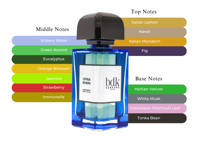 It is a unique fragrance with notes including Moroccan neroli, Italian mandarin orange, Italian lemon, fig, Moroccan orange blossom absolute, Jasmine, Strawberry, Eucalyptus, Immortelle absolute, white musk, Indonesian patchouli and Haitian vetiver. BDK Citrus Riviera is a citrusy-fresh scent that's perfect for summertime. This fragrant floral-fruity perfume has a luminous, modern feeling that makes it an ideal choice for those who want to smell fresh and clean all day long.