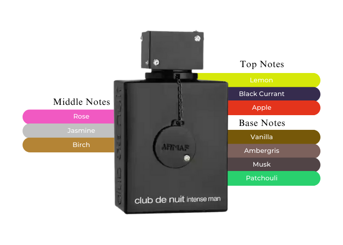 Club De Nuit Intense Man EDP opens with a refreshing blend of lemon, blackcurrant, and apple. This lively combination is swiftly followed by the heart notes of jasmine and birch, which lend a floral and woody depth to the perfume. The base notes of vanilla, ambergris, musk, and patchouli wrap up the scent, providing a warm and lingering finish that is sure to captivate.