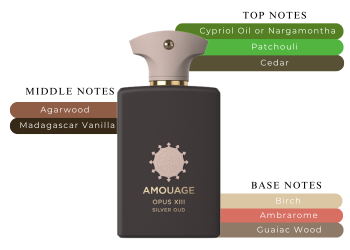 Opus XIII Silver Oud opens with a rich blend of Cypriol oil, Virginia cedar, and patchouli, providing an earthy and woody introduction. At its core, it features a luxurious combination of agarwood (oud) and Madagascar vanilla, which adds depth and sensuality. The base notes of castoreum, amber, birch, and guaiac wood create a lasting impression, enveloping the wearer in warmth and sophistication.