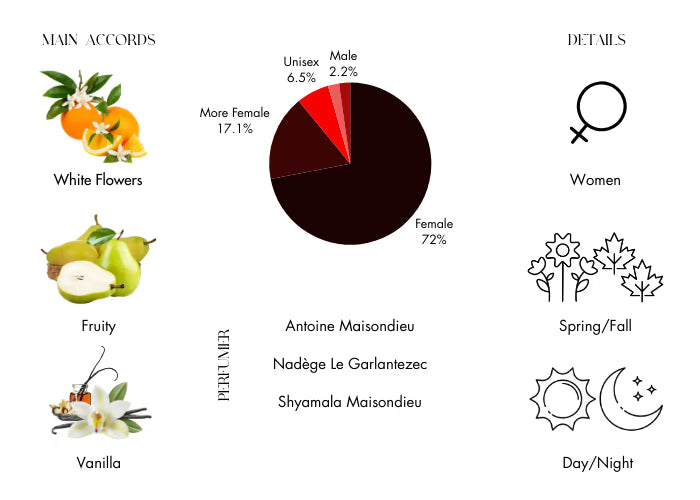 Paradoxe EDP opens with the fresh and invigorating top notes of Pear, Tangerine, and Bergamot, creating an inviting and refreshing beginning. As you delve deeper, the heart of the scent reveals a bouquet of Orange Blossom, Jasmine Sambac, Neroli Essence, and Neroli, enveloping you in a floral embrace that is both delicate and enchanting. Finally, the base notes of Bourbon Vanilla, White Musk, Benzoin, and Amber provide a warm and sensual finish, leaving a trail of elegance and mystery.