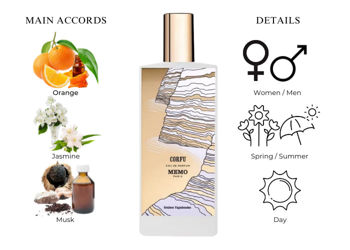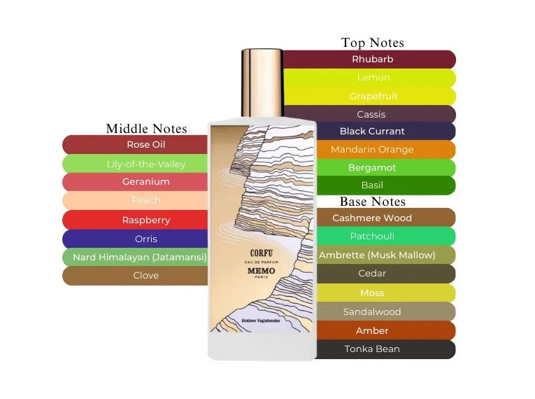 Corfu opens with a zesty blend of tart rhubarb, effervescent citrus, and aromatic basil, gradually evolving into a gentle and refined floral bouquet. The heart of the fragrance showcases notes of rose, geranium, jasmine, and lily-of-the-valley, harmonized with hints of raspberry and peach. The base notes are anchored by a sophisticated musk, providing a warm and enduring finish. Corfu is a contemporary chypre fragrance that leaves a lasting impression, evoking the experience of a dip in the Ionian Sea.
