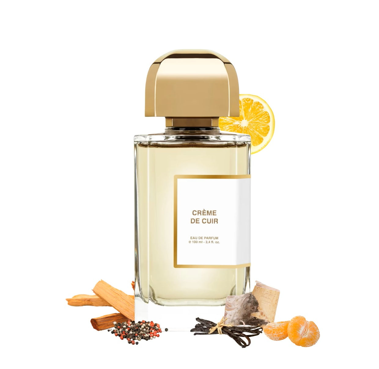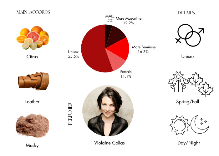Creme De Cuir creates a refreshing opening with a zesty blend of pineapple, grapefruit, mandarin orange, and bergamot, sparking an invigorating sensation that awakens the senses. This lively introduction is seamlessly followed by the heart notes, where white suede meets the creamy warmth of sandalwood, intertwined with the subtle spice of pink pepper and pepper.
