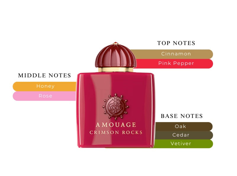 Crimson Rocks opens with a tempting blend of cinnamon and pink pepper, reminiscent of smoldering peaks. The heart notes unveil a refined mix of honey and rose, adding a sweet and sophisticated touch. The base notes of oak, Atlas cedar, and vetiver establish a warm, earthy foundation that enhances the fragrance's depth and longevity. Crimson Rocks by Amouage is a luxurious and regal perfume that embodies the breathtaking beauty of the Al Hajar mountains.