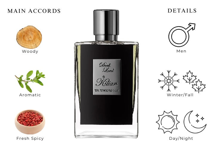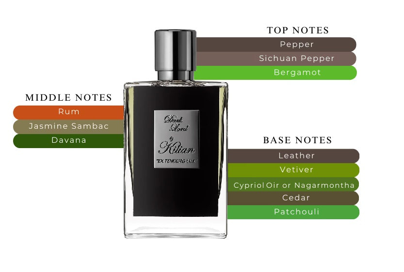 Dark Lord by Kilian is unique, enchanting, and thought-provoking, featuring spicy top notes of Sichuan pepper,renowned for its fragrant lemony nuances,and Bourbon pepper from Madagascar, which contributes its spicy and terpene characteristics. The scent unfolds with intricate layers of jasmine, vetiver, leather, and bergamot, complemented by a subtle animalic hint of rum.