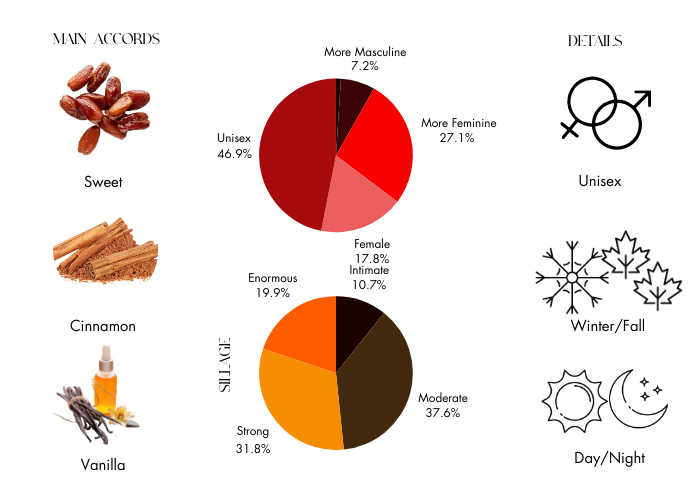 Dates Delight opens with the sweet notes of dates and peony, evolving into a heart composed of caramel, cinnamon, coumarin, and tonka bean. The base features a rich blend of honey, sugar, vanilla, benzoin, and labdanum, creating a delightful gourmand aroma with Arabic influences. It boasts above-average longevity and remains in production. This enchanting creation is the result of a collaboration between an Italian master perfumer and an oud enthusiast from Jakarta.