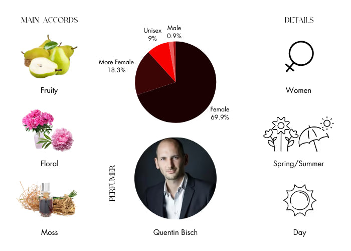 Delina La Rosee enchants with a fusion of translucent water flowers and peony, creating an ethereal scent profile. It opens with captivating pear notes, leading to a subtle foundation of sandalwood and gentle musk. At its heart lies a poetic bouquet of Turkish rose, making Delina La Rosee a tribute to feminine grace. Its enduring quality guarantees a fragrance that lasts throughout the day, exuding an irresistible charm.