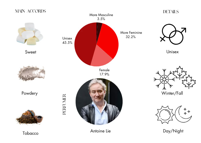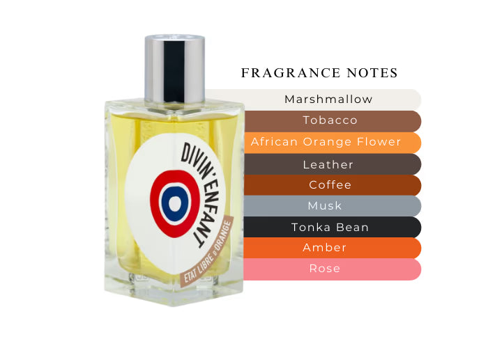 Divin'Enfant opens with soft top notes of orange blossom and marshmallow, leading into an unexpected blend of coffee, leather, and cold tobacco, echoing the restless nights of parenthood. As the fragrance unfolds, it reveals notes of patchouli, musk, and a bouquet of white flowers. The overall profile is sweet and powdery, with a touch of tobacco and a warm, spicy undertone. It concludes with a rich base of leather and musk, providing above-average longevity.