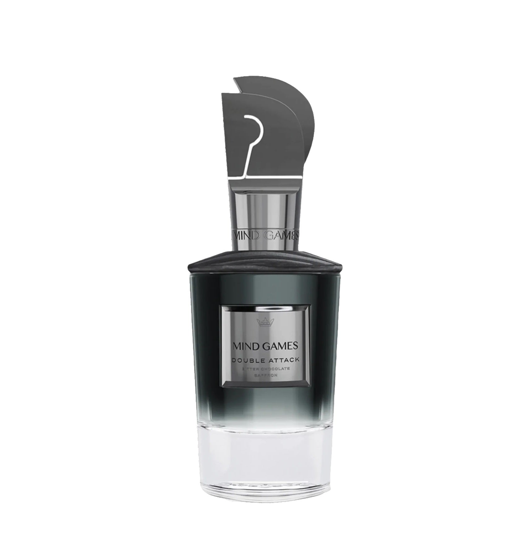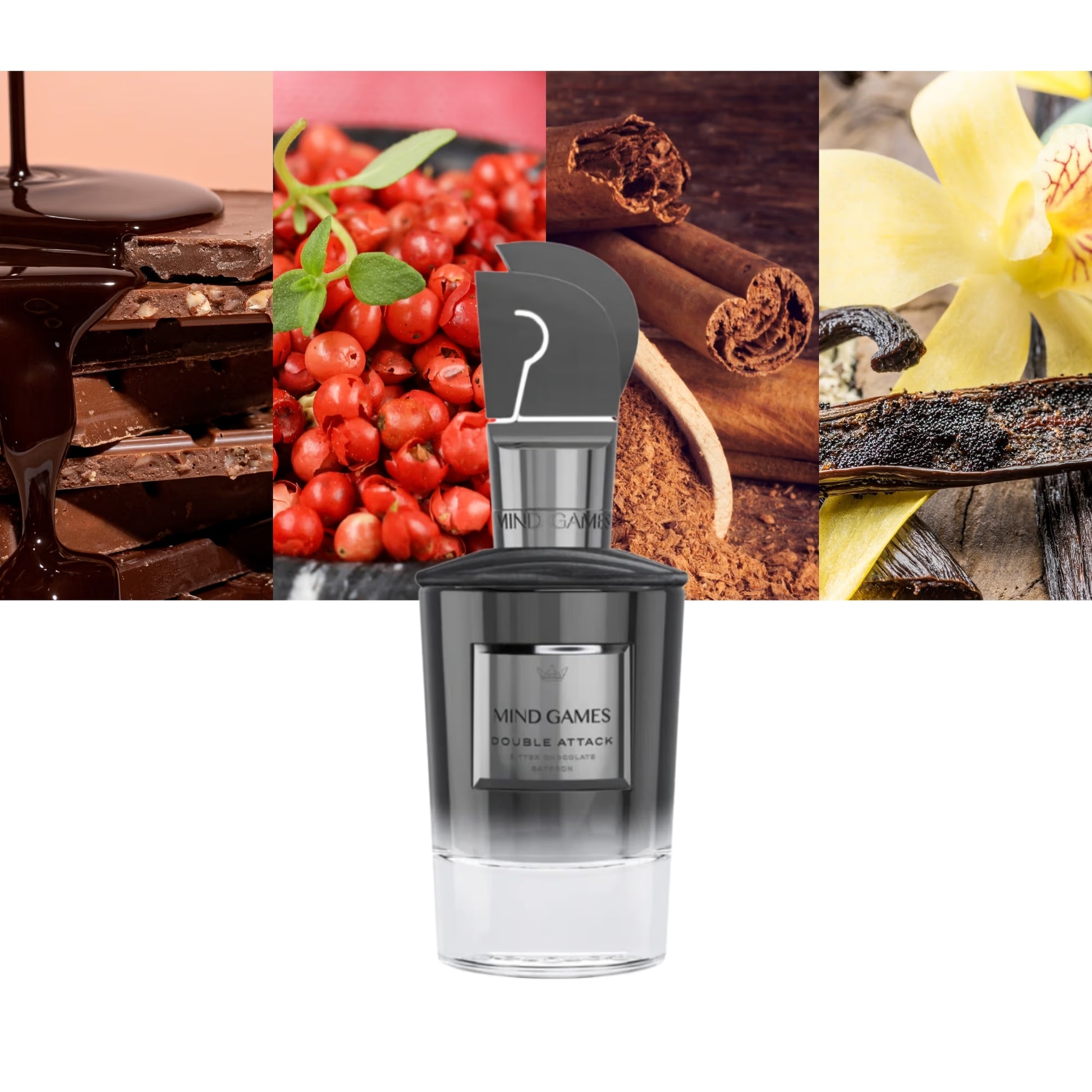 Double Attack opens with invigorating top notes of bitter orange, pink pepper, and pimento, creating an energizing and spicy introduction. As the fragrance unfolds, the heart notes of cinnamon, agave, and geranium weave a warm and inviting tapestry, enveloping you in a rich and exotic aroma. The journey culminates with base notes of dark chocolate, Madagascar vanilla, sandalwood, and bourbon vetiver, leaving a lasting impression that is both sweet and woody.