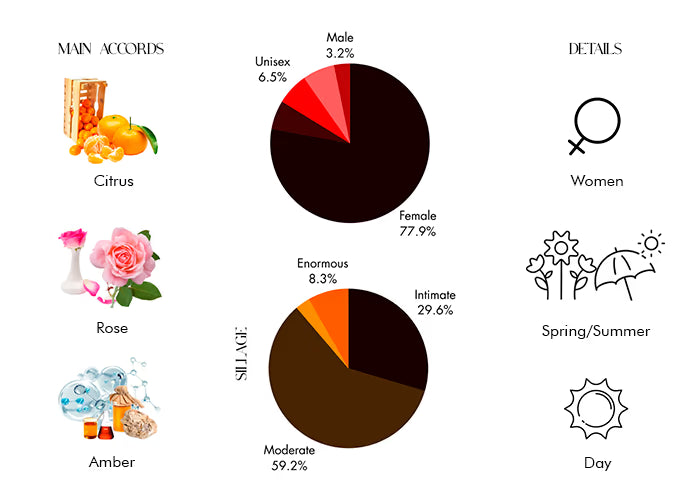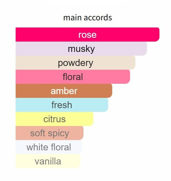 Eladaria opens with a radiant burst of mandarin, pink pepper, and bergamot, creating a sparkling and fresh introduction. As it settles, a heart of rose, powdery notes, peony, and lily of the valley bloom beautifully, wrapping you in a soft, romantic embrace. Finally, the fragrance lingers with a warm and sensual base of ambroxan, vanilla, cashmere wood, and musk, leaving a lasting impression of elegance and sophistication.