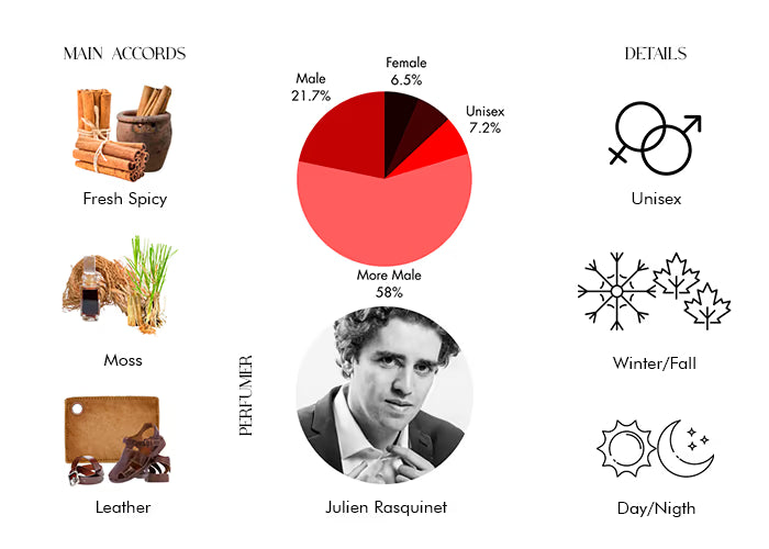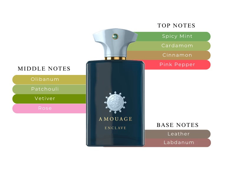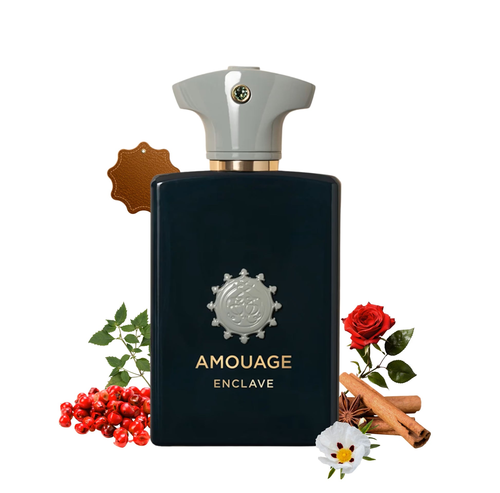 Enclave begins with a lively combination of spicy mint, cardamom, cinnamon, and pink pepper, offering a dynamic and spirited opening. As the fragrance evolves, it reveals notes of olibanum, patchouli, vetiver, and rose, enriching the scent with depth and complexity. The base features luxurious notes of amber Xtreme, leather, and labdanum, creating a sensual foundation. Enclave captures the essence of a lush, earthy retreat where land meets sea.
