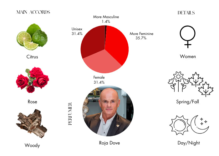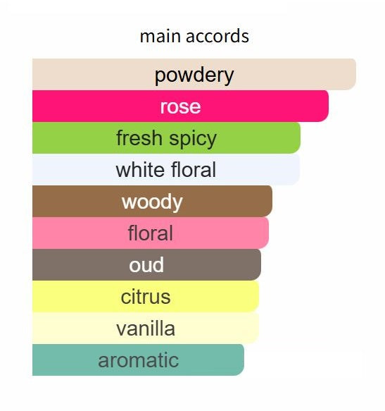 Delight your senses with the sparkling top note of Bergamot, which opens the fragrance with a burst of freshness. As the scent develops, the heart reveals a lush bouquet of Peach, May Rose, Ylang-Ylang, Neroli, Heliotrope, Geranium, and Jasmine. These floral notes intermingle to create a rich, feminine allure that is both enchanting and sophisticated.