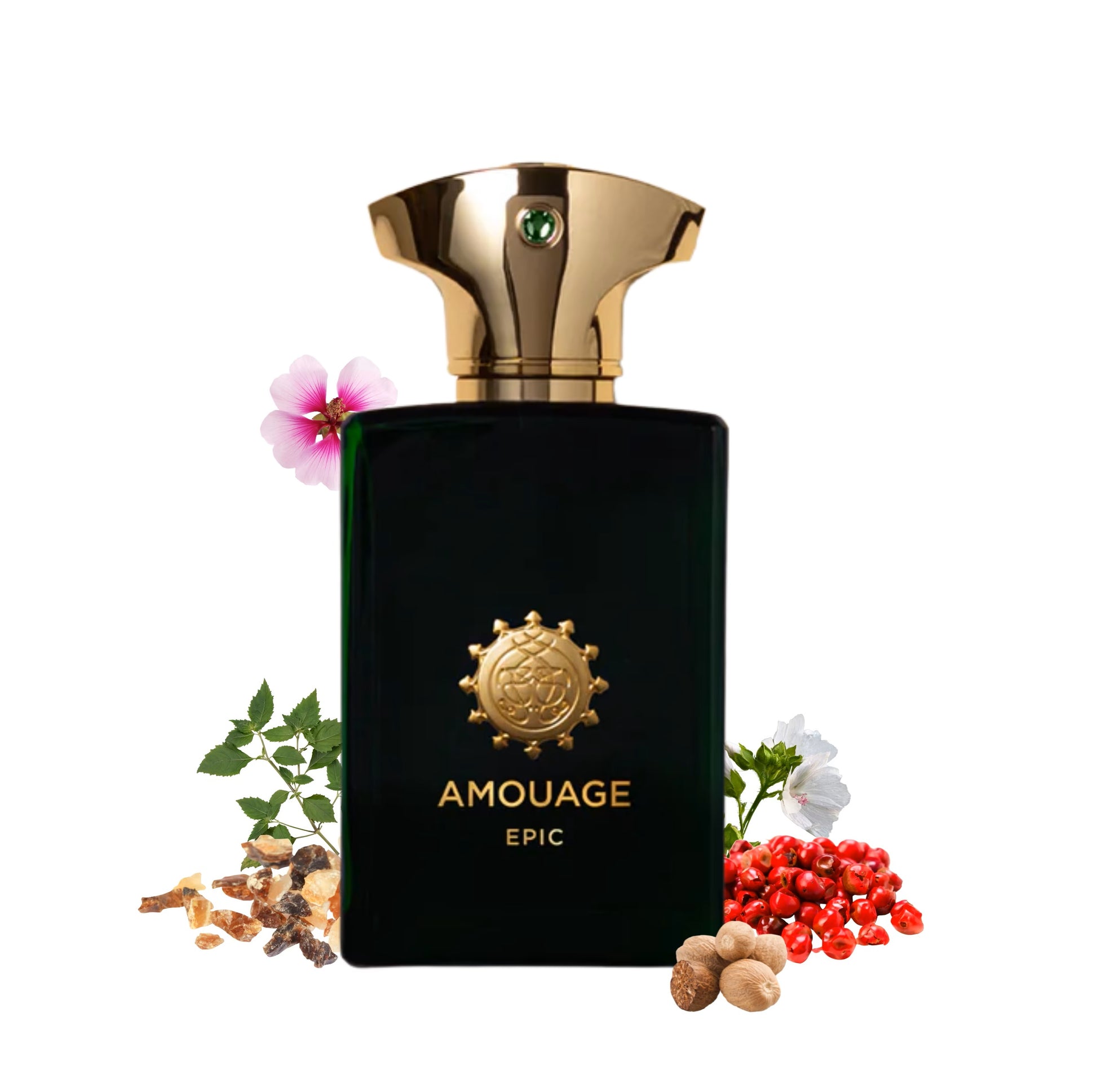 Epic Man opens with an intriguing blend of top notes including pink pepper, berry essence, frankincense, cumin, cardamom, saffron, mace, nutmeg, and myrtle. The heart of the fragrance is a harmonious fusion of geranium and myrrh, which adds a floral yet resinous depth to the scent, making it both bold and elegant.
