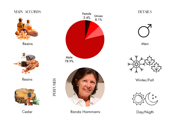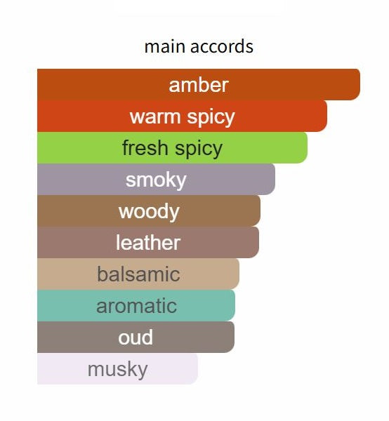 As the scent settles, the base notes of oud, sandalwood, patchouli, leather, frankincense, cedarwood, musk, and castoreum emerge.