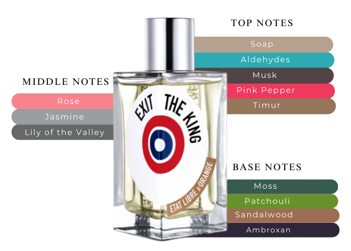 Exit The King by opens with a vibrant combination of soapy nuances, a hint of salty, citrusy Timur spice, aldehydes, pink pepper, and airy musk. The heart reveals a floral bouquet of rose, jasmine, and lily-of-the-valley, while the base is anchored by moss, patchouli, sandalwood, and Ambroxan. With its impressive longevity, Exit The King blends fresh, synthetic, spicy, and earthy elements, offering a rich olfactory journey that boldly asserts: nothing can govern us.