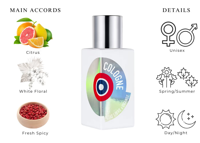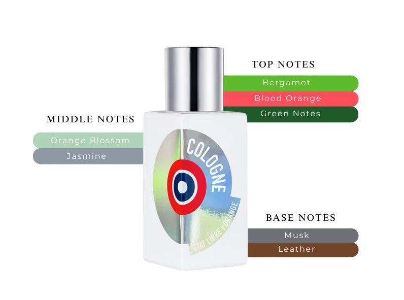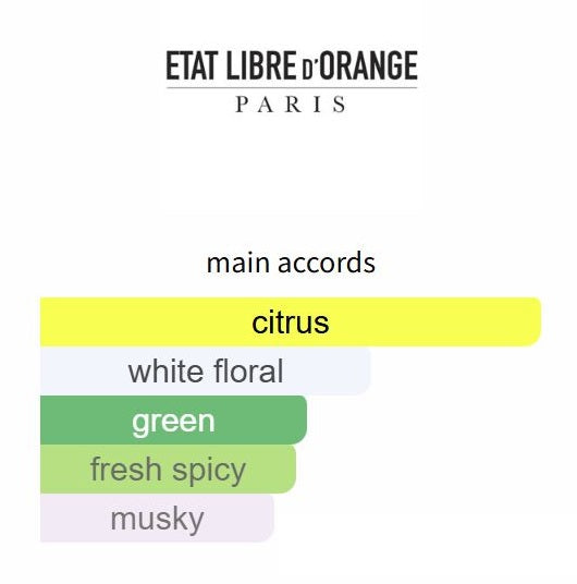 Etat Libre d'Orange Cologne opens with top notes of bergamot and blood orange, intertwined with fresh green elements. As these bright initial notes fade, the heart reveals a captivating blend of orange blossom and jasmine, exuding a lively floral charm. The fragrance is grounded by base notes of musk and leather, which add a rich depth that balances the initial citrus brightness. This cologne defies the mundane and uninspired, conveying a universal emotional resonance.