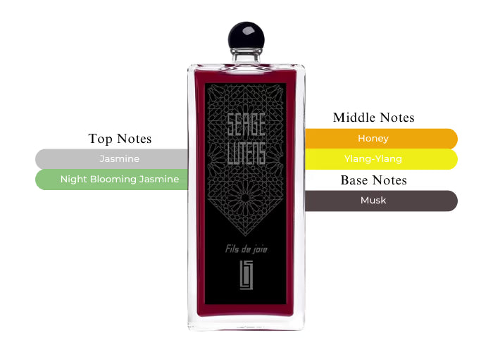 Fils de Joie opens with an enchanting combination of jasmine and night-blooming jasmine, capturing the essence of the evening flower. The heart features a delightful blend of honey and ylang-ylang, enriching the scent with a sweet, nectar-like quality. Beneath these layers lies a base of musk, which adds a sensual, warm finish. Its floral-sweet aroma, along with its notable projection and longevity, ensures it leaves a lasting impression on the skin.