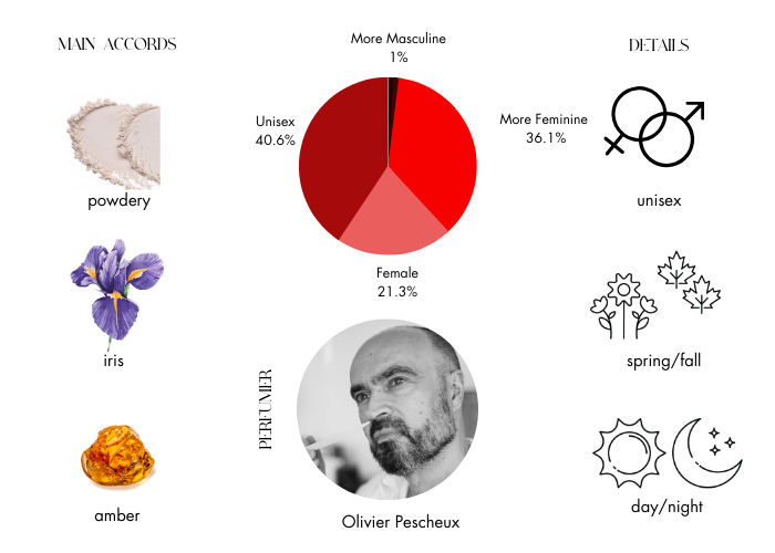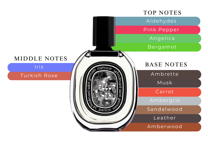 Fleur de Peau begins with a lively combination of Aldehydes, Pink Pepper, Angelica, and Bergamot, offering a vibrant and alluring opening. The heart of the fragrance features Iris and Turkish Rose, infusing it with a touch of elegance and romance. The base notes of Musk, Ambrette (Musk Mallow), and Carrot provide a warm and sensual foundation. Fleur de Peau is a beautifully balanced perfume that harmoniously blends sweet, slightly animalic, and fruity notes.
