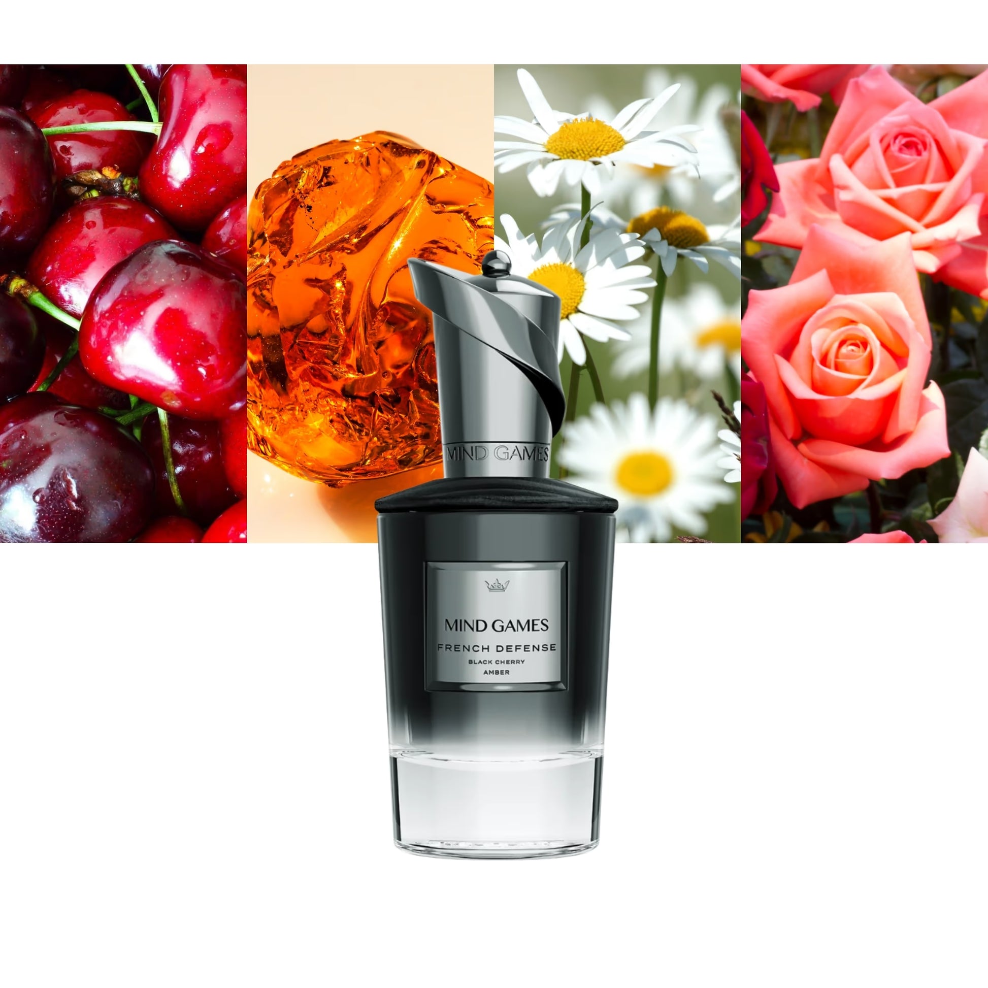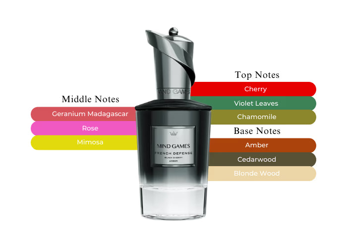 French Defense begins with the top notes of cherry, violet leaves, and chamomile, creating a fresh and inviting introduction. As the fragrance unfolds, the heart notes of rose, geranium, and mimosa bloom, offering a floral embrace that is both warm and intriguing. Finally, the base notes of amber, blonde woods, and cedarwood provide a rich and lasting finish that lingers with sophistication.