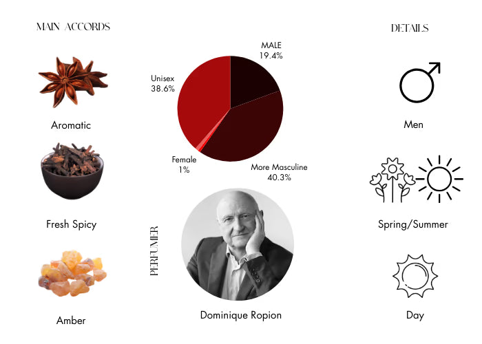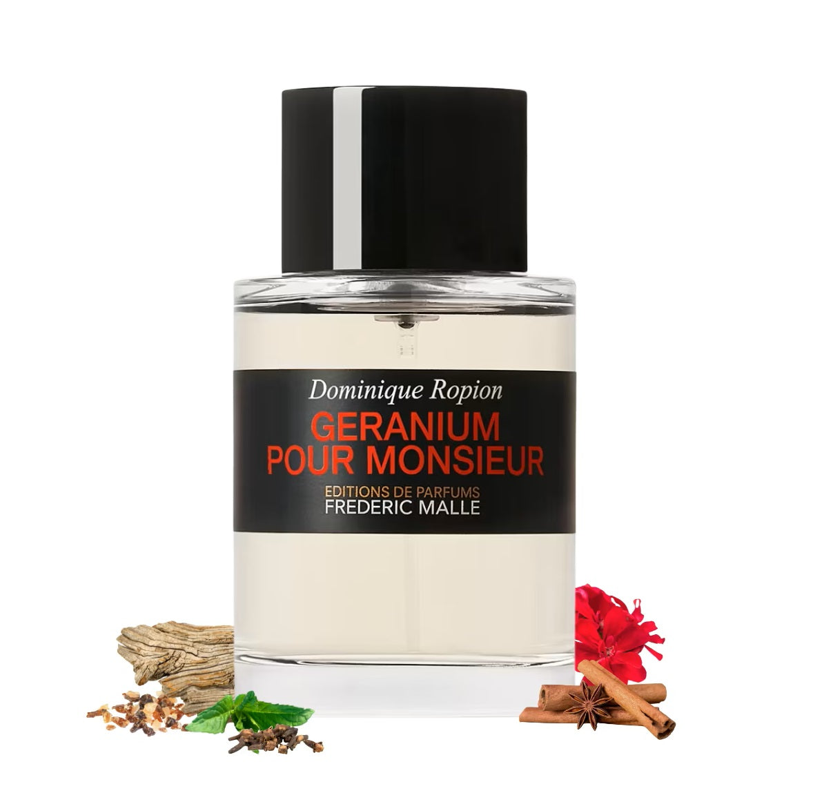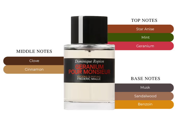 Geranium Pour Monsieur begins with a lively blend of fresh mint, geranium, and star anise. This invigorating opening transitions into a heart enriched with clove and cinnamon, adding a touch of subtly spiced elegance. Finally, the scent evolves into a base of musk, sandalwood, incense, styrax, and benzoin, offering a captivating and timeless conclusion.
