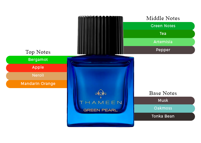 Green Pearl by Thameen opens with a refreshing combination of top notes including Bergamot, Apple, Neroli, and Mandarin Orange. This quickly evolves into a heart of Green Notes, Tea, Artemisia, and Pepper, adding an intriguing spicy complexity. The scent finishes with base notes of Musk, Oakmoss, and Tonka Bean, leaving a lasting impression. Green Pearl is defined by its green, citrus, fresh spicy, fruity, and aromatic nuances.
