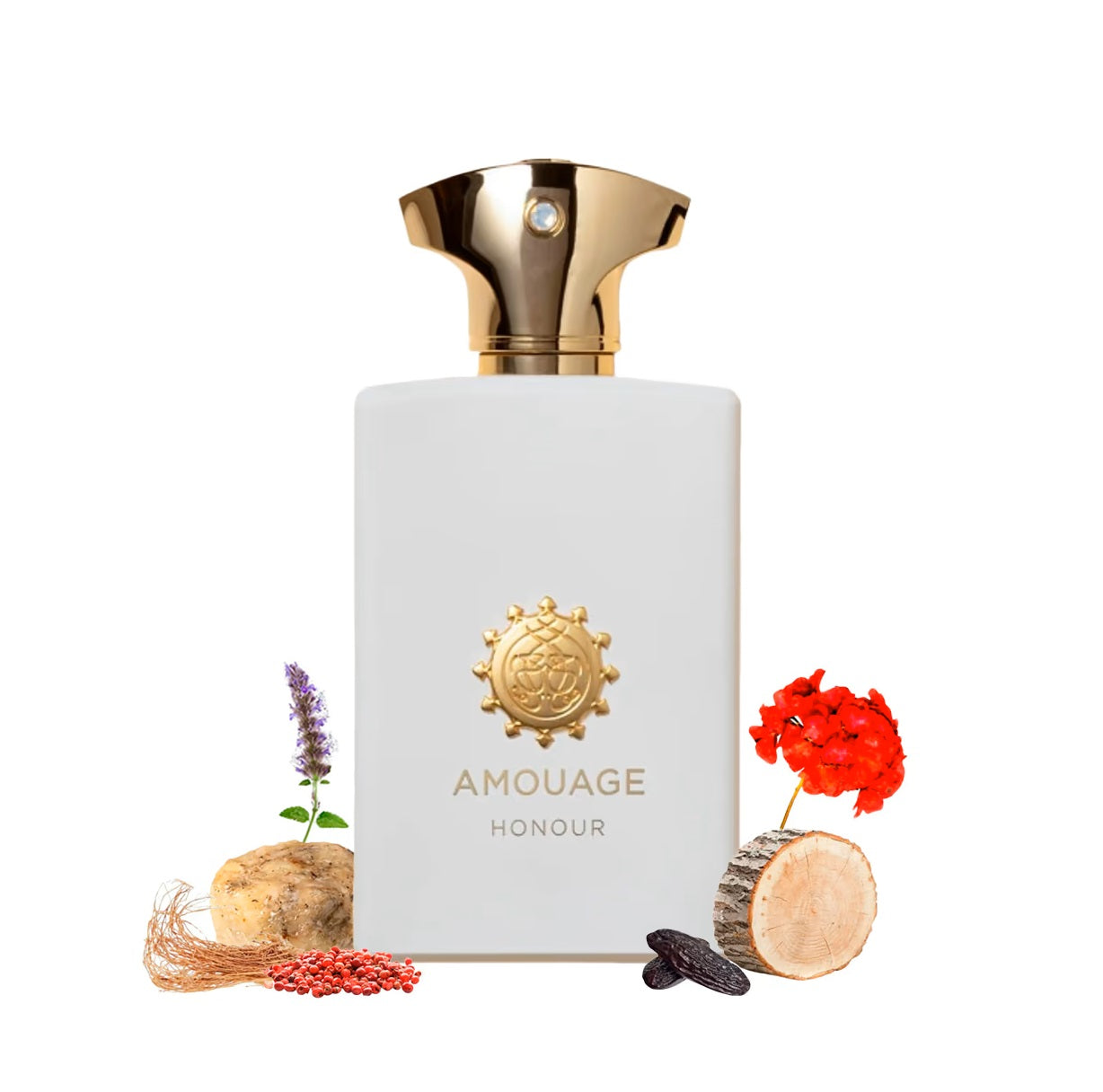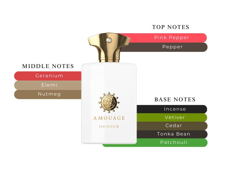 Honour Man opens with a vibrant mix of pink and black peppers, offering a fresh and spicy introduction. This is followed by heart notes of geranium, elemi, and nutmeg, which add richness and complexity to its character. The base notes of patchouli, frankincense, cedarwood, vetiver, tonka bean, and musk create a subtly resinous and smoky foundation. This combination results in a fresh, confident aroma that makes a memorable impact.