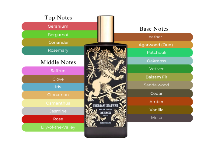 Memo Paris Iberian Leather embodies the essence of cedar from the lion. It begins with a top note combination of aromatic herbs and citrus, complemented by geranium, which transitions into a floral heart featuring a bouquet of iris, lily of the valley, rose, jasmine, and Osmanthus. The base notes include cedar, vetiver, patchouli, and oakmoss, reinforcing its woody character. Dark spices, saffron, and vanilla add an intriguing depth to its allure.