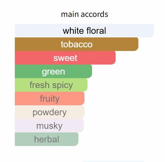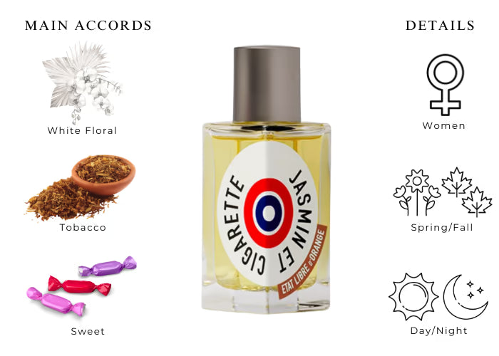 Jasmin et Cigarette artfully combines contrasting elements, evoking the essence of a glamorous vamp and an enigmatic seductress. It pays tribute to the classic femmes fatales, encapsulating the charm of Hollywood glamour interwoven with a hint of 1980s defiance. The perfume captures the essence of a woman's skin enveloped in the dark allure of night, leaving behind a lasting impression of fantasy and intimate reminiscence. It opens with vibrant, fresh indolic jasmine buds, exuding a spring-like quality, yet the fragrance unfolds to reveal a rich and intricate narrative.