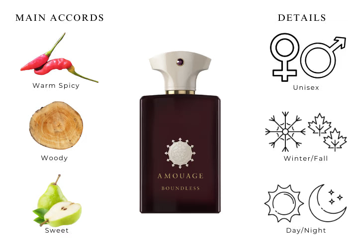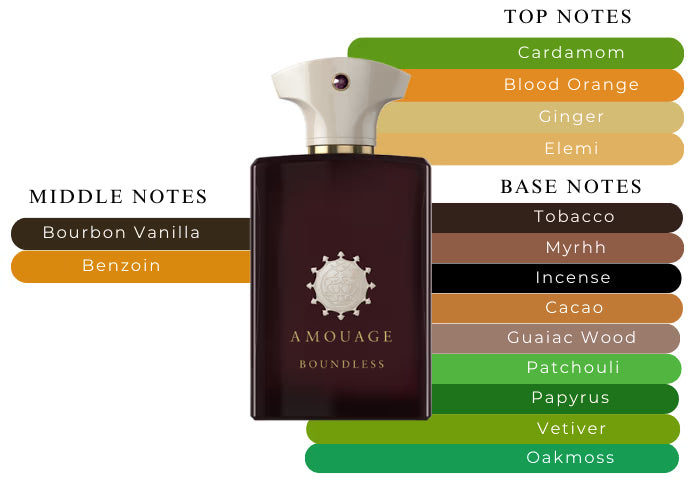 Boundless opens with refreshing top notes of blood orange, cardamom, ginger CO2, and elemi, establishing a lively and dynamic presence. The heart of the fragrance unveils the comforting essence of bourbon vanilla and benzoin, contributing a seductive and sweet nuance. The base notes, featuring guaiac wood, papyrus, cocoa absolute, tobacco absolute, oakmoss absolute, frankincense absolute, frankincense oil, myrrh resinoid, vetiver, and patchouli, offer a refined and lasting foundation.
