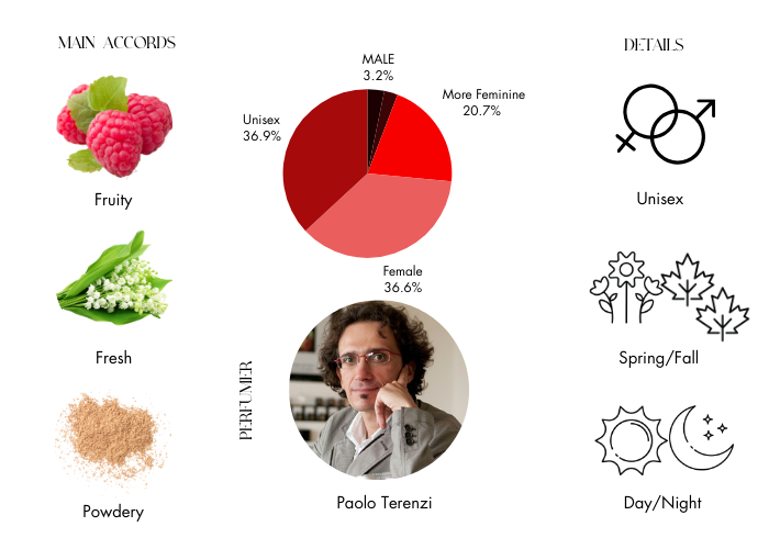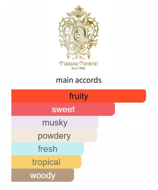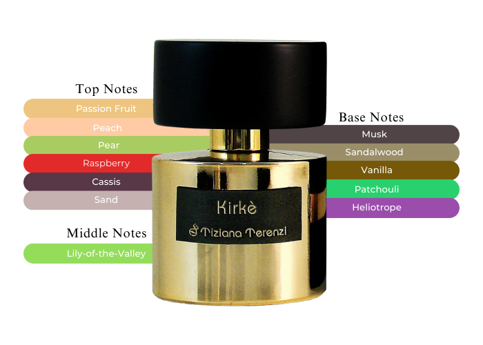 Kirke by Tiziana Terenzi opens with an exhilarating mix of Passionfruit, Peach, Pear, Raspberry, Cassis, and Sand. At its heart, it reveals the gentle freshness of Lily-of-the-Valley. As the scent evolves, the base notes of Musk, Sandalwood, Vanilla, Patchouli, and Heliotrope emerge, creating a lasting and captivating allure.