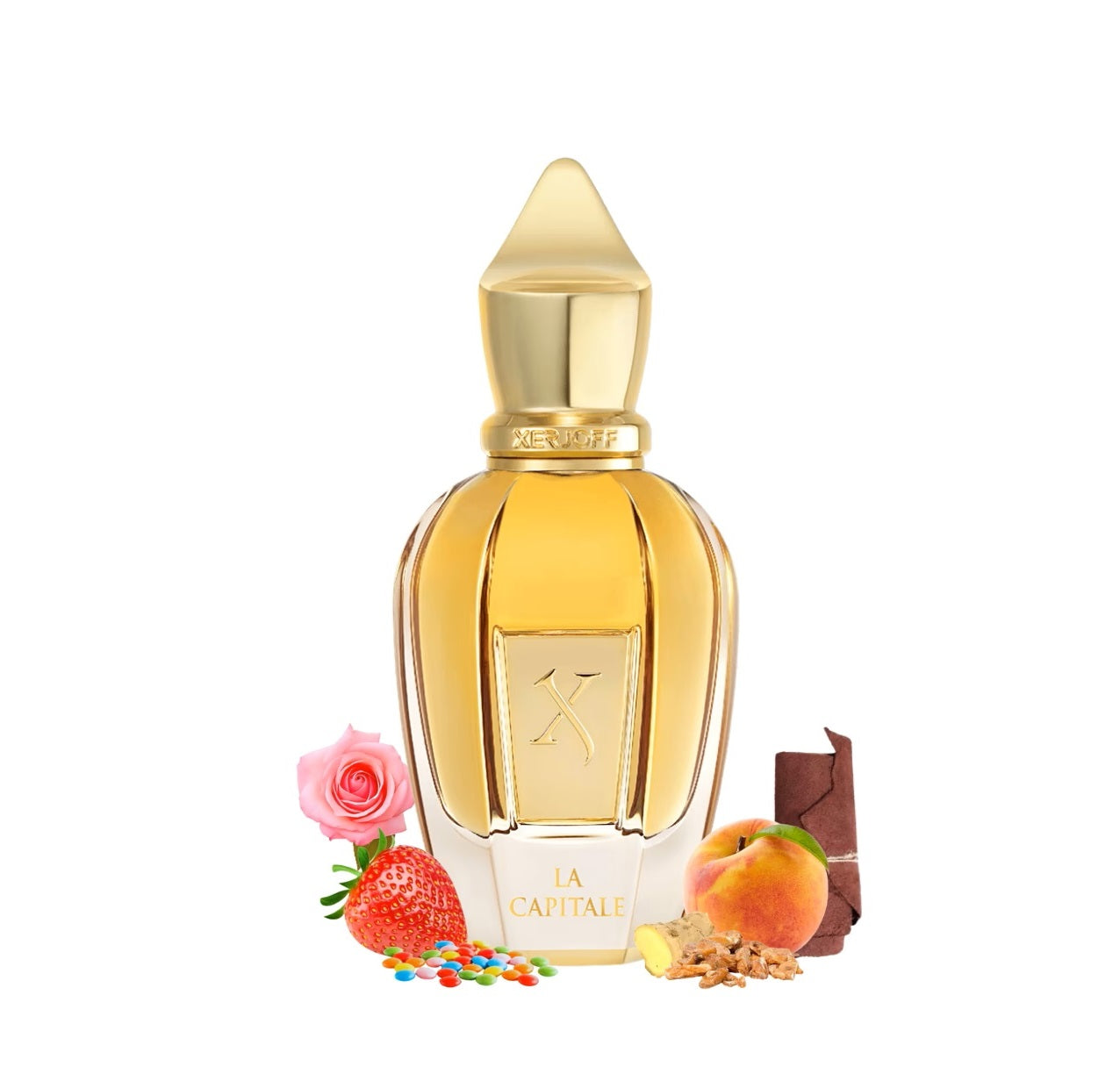 La Capitale opens with a delicious burst of strawberry, caramel, and peach, accented by the warm depth of labdanum. This sweet yet sophisticated introduction sets the stage for a heart that’s both exotic and refined, featuring leather, saffron, amber, ginger, and a touch of romantic rose. As the fragrance settles, it reveals a smooth and comforting base of bourbon vanilla and benzoin, leaving a lingering trail that’s both inviting and unique.