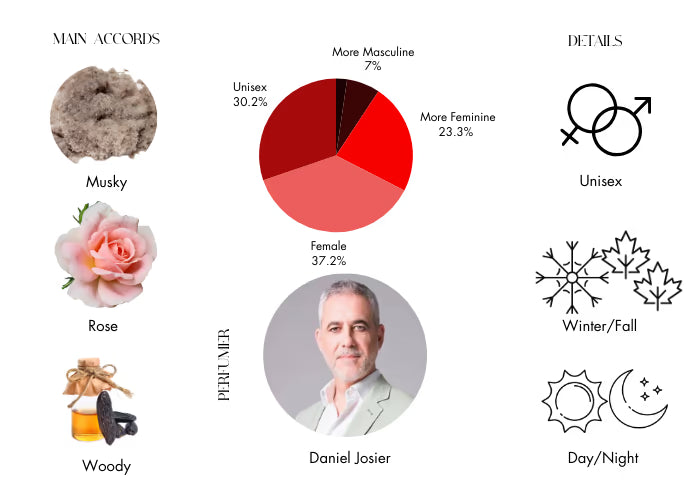 Le Musk opens with muscone, angelica, and abelmoschus seeds, who confers a musky character that gives way to a heart with Bombay wood, patchouli, and rose details. It’s inspired by the princesses' scents, who utilized musk and rose essence to perfume hair and body.